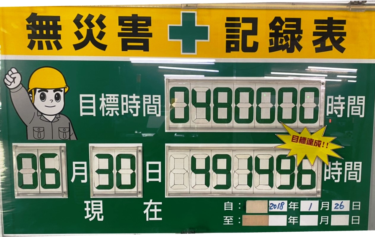依據「無災害工時活動」之級距表,僱用勞工人數100~200人,達成時數目標480,000 小時,實績491496小時。